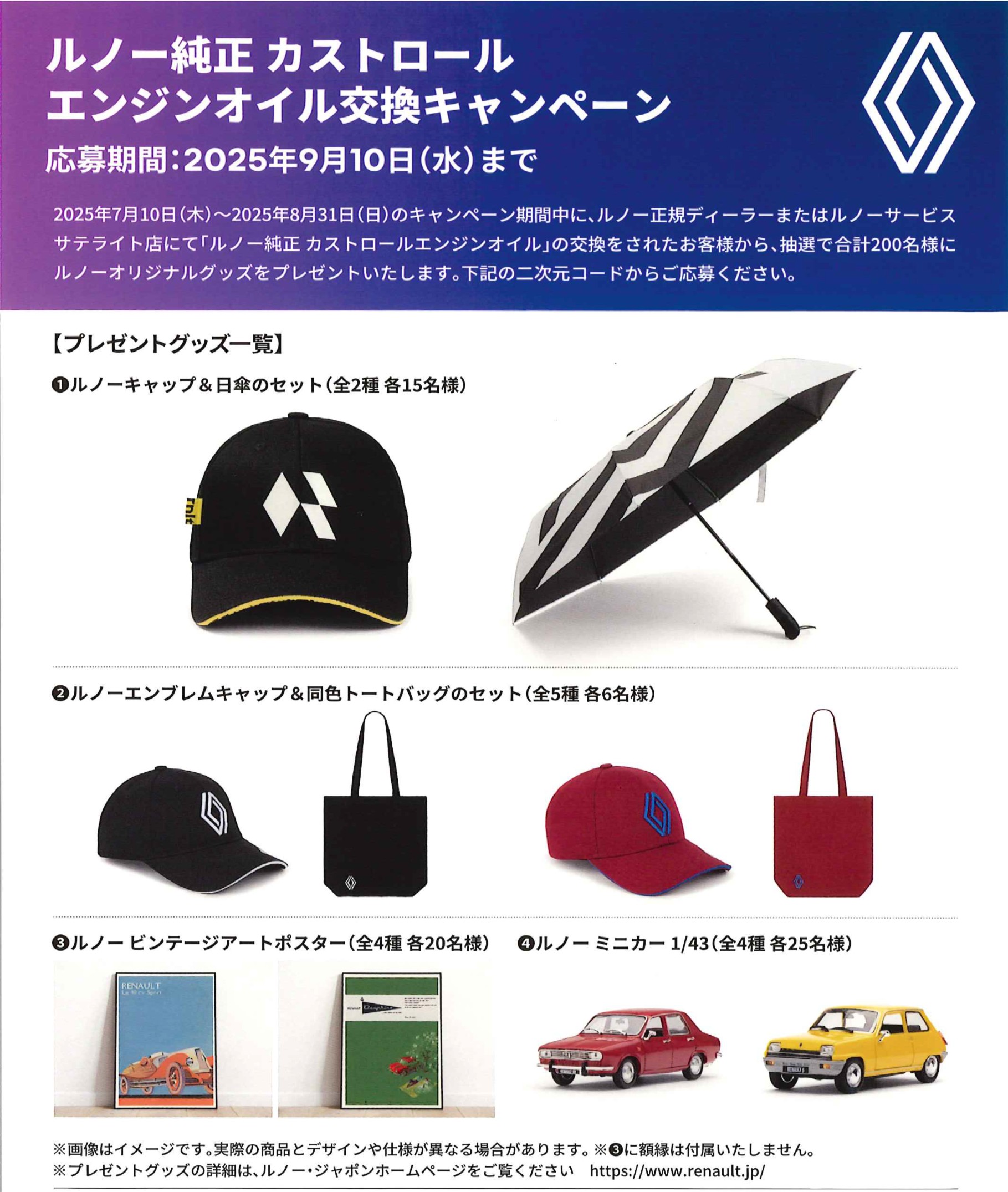 期間中ルノー純正カストロールエンジンオイルを交換いただき、応募サイトから応募いただいたお客様抽選で200様にルノーオリジナルグッズをプレゼント!
